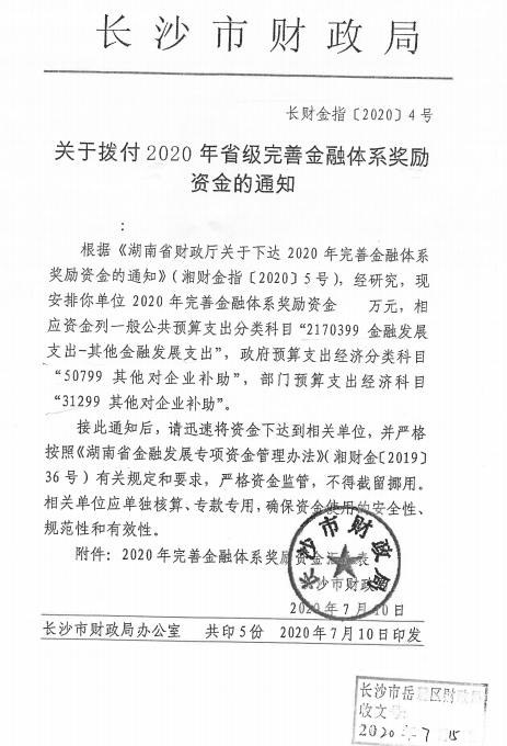 上月底,湖南省地方金融监督管理局、湖南省财政厅官网公示2020年度省级金融发展专项资金奖励名单,拟对担保公司给予200万元奖励。7月24日,长沙市财政局下发《关于拨付2020年省级完善金融体系奖励政策资金的通知》(长财金指〔2020〕4号),担保公司喜获200万元专项资金奖励。