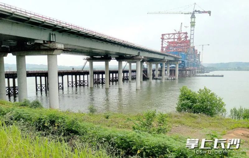 端午小长假期间,暮坪湘江特大桥建设工地施工忙。暮坪湘江特大桥桥梁全长3.928公里,预计今年10月合龙。